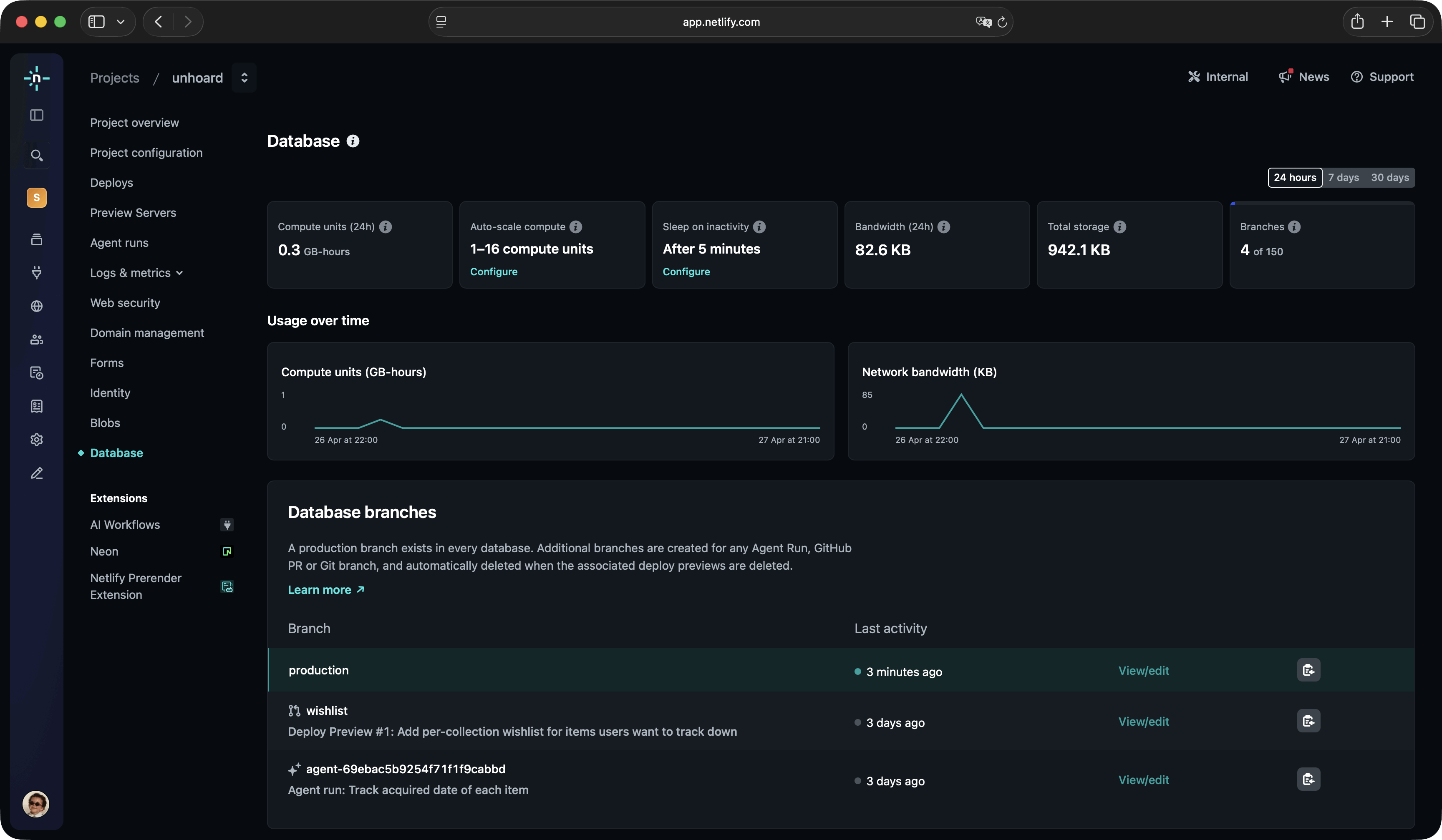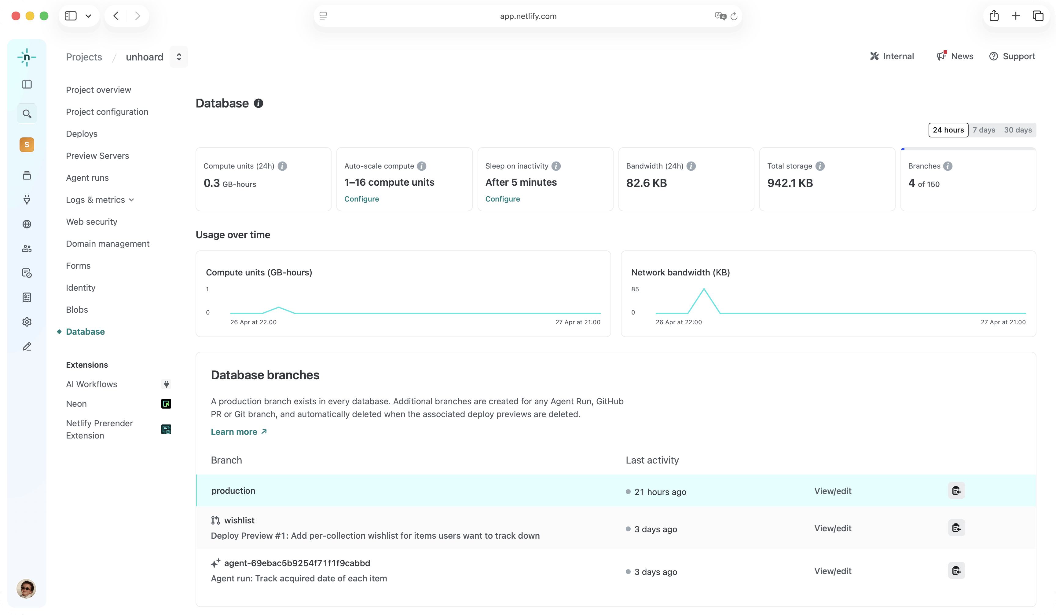 The Netlify Database dashboard is the central place for inspecting and managing your database from the Netlify UI. It surfaces real-time usage metrics, gives you a per-branch view of your data, and exposes runtime settings like auto-scale compute and sleep on inactivity.