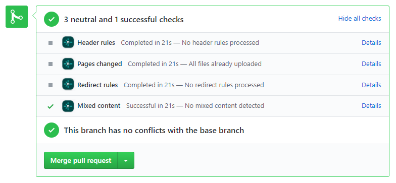 Section titled “GitHub commit checks”This type of notification adds rich deploy information from your deploy summary to your GitHub pull requests and commit lists. This includes more detailed information in the Checks tab of your pull requests on GitHub.