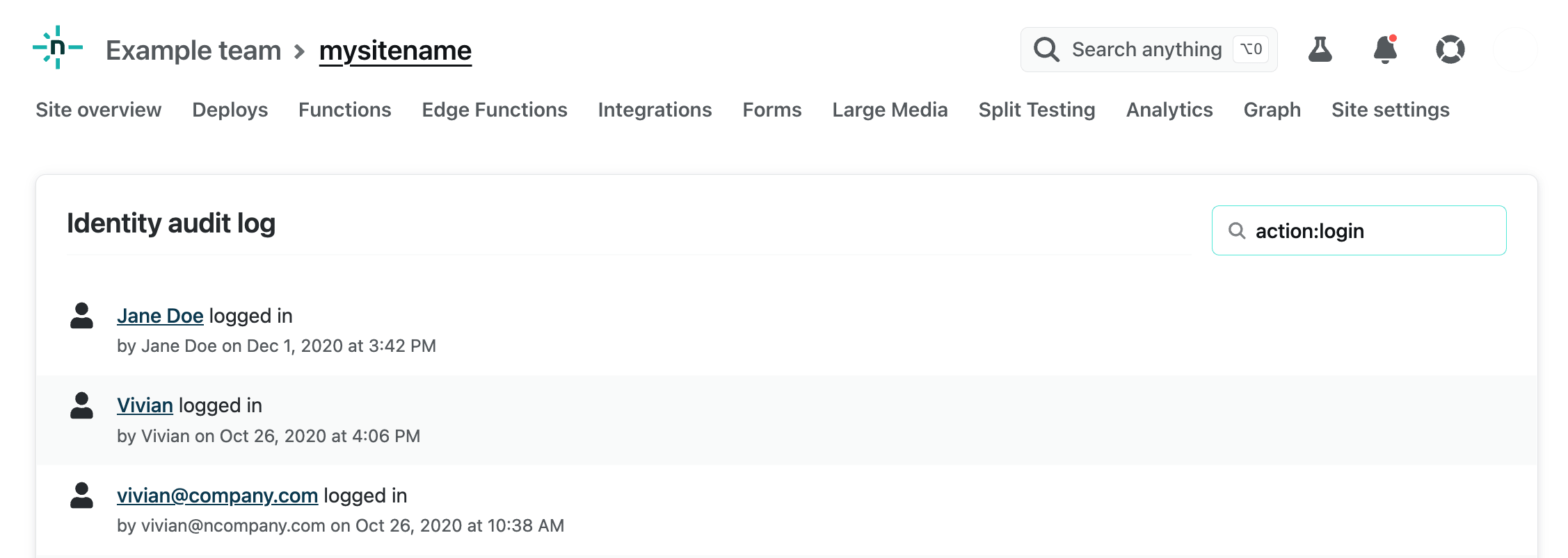 Netlify keeps a log of actions taken by your Netlify Identity users. To access a site’s Identity audit log, take these steps: